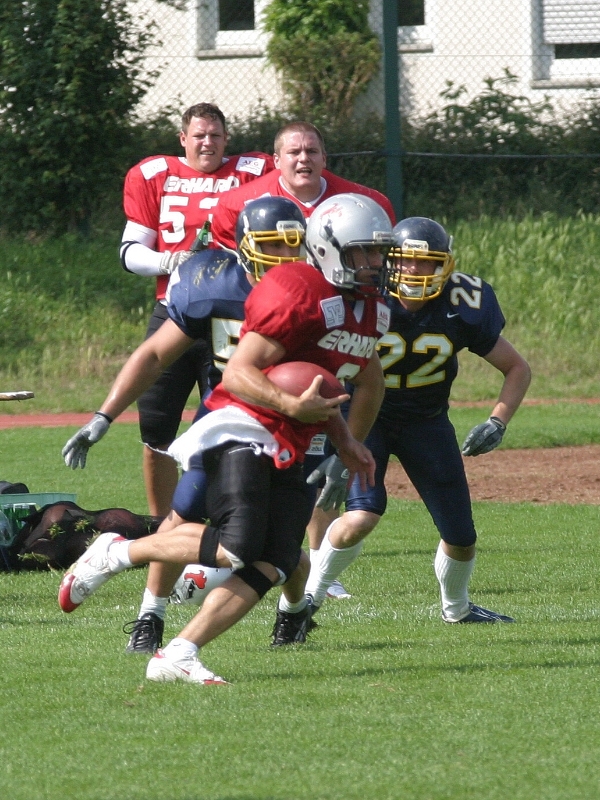 Dank einiger Fehler der Gäste konnten die Redskins schnell mit 21:0 in Führung gehen. Der abschließende Schlagabtausch mit wechselnden Momentum brachte die Gladiatoren trotz Kampf immer wieder ran, aber die Redskins nie wirklich in Gefahr. Phasenweise ein munteres Spielchen, wurde es doch durch zu viele Unterbrechungen ein langer nachmittag in der Sonne.